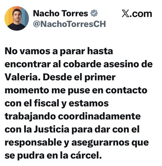 “No vamos a parar hasta encontrar al cobarde asesino de Valeria. Desde el primer momento me puse en contacto con el fiscal y estamos trabajando coordinadamente con la Justicia para dar con el responsable y asegurarnos que se pudra en la cárcel”, indicó el mandatario provincial.