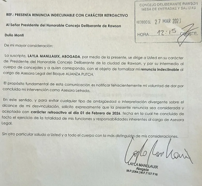 Lo interesante de la renuncia es que la misma fue dirigida al presidente del Concejo Deliberante de Rawson, Dulio Monti, lo cuál abre algunos interrogantes sobre el final de la relación laboral y política con Luque y las razones por las cuáles no le informó directamente a la edil libertaria sobre su decisión.